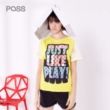 PASS旗舰店夏季前短后长短袖T恤镂空撞色体恤女