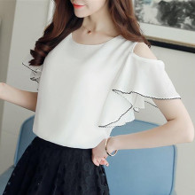 夏季荷叶边雪纺衫女短袖宽松显瘦甜美喇叭袖露肩上衣百搭半袖t恤