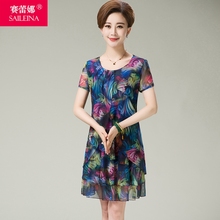 赛蕾娜中老年女装连衣裙大码妈妈装短袖印花显瘦夏中长裙40-50岁