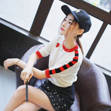 钉珠套头宽松t恤女短款夏季2017欧美女装小清新刺绣冰丝针织衫薄
