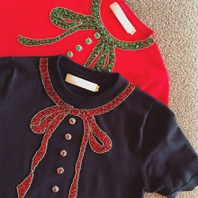 蝴蝶结钉珠冰丝针织衫女套头短款春夏韩版甜美短袖t恤打底衫薄款
