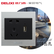 德力西开关插座 五孔带usb插座面板 USB充电口电源插座面板拉丝铝