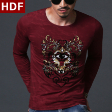 秋季潮男烫钻长袖印花t恤男装个性图案体恤潮流修身打底男小衫