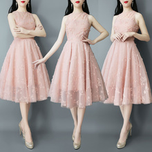 2017夏季新款女装小清新性感无袖显瘦粉色蕾丝连衣裙公主裙蓬蓬裙