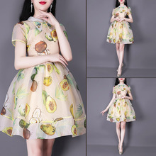 甜美娃娃领公主裙成人短袖蓬蓬裙2017新款女装雪纺印花连衣裙女夏