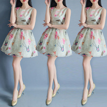 2017夏装新款性感名媛高腰公主裙显瘦蓬蓬裙无袖印花雪纺连衣裙女