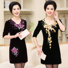 春夏装中老年女装中长款连衣裙中年女妈妈装长袖丝绒打底绣花裙子