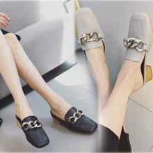 2017春夏新款复古中跟女鞋金属链条方头半拖鞋包头粗跟凉拖鞋外穿