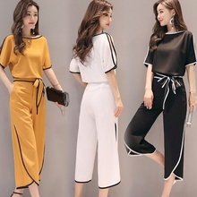 套装女夏装新款圆领露肩短袖气质显瘦修身七分裤喇叭阔腿裤两件套