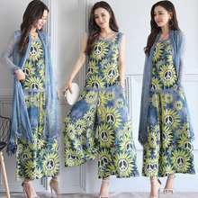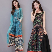 阔腿裤套装女2017春装新款名媛气质显瘦开衫印花背心九分裤三件套