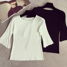 2017春夏新款一字领七分袖开叉白色针织衫打底衫女装搭配