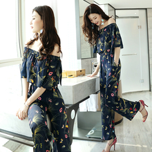 连体裤女夏2017新款时尚韩版高腰一字肩抹胸碎花雪纺九分裤阔腿裤