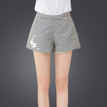 2016夏季新款女装修身白色条纹短裤阔腿高腰显瘦热裤立体刺绣绣花