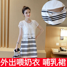 哺乳衣春秋外出时尚韩版短袖连衣裙夏季条纹显瘦哺乳期喂奶衣服