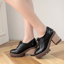 17春季新款英伦风小皮鞋布洛克复古系带厚底粗高跟深口单鞋女鞋子
