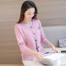 2017春装新款女韩版宽松口袋圆领纯色长袖针织衫短款开衫女士上衣