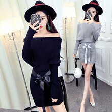 秋冬针织连衣裙长袖修身显瘦中长款性感一字领露肩收腰毛衣打底裙