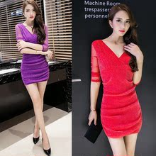 夜店大码女装连衣裙深V领低胸网纱透视性感修身包臀长袖打底裙春