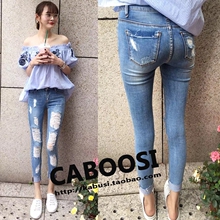 17年新浅蓝色大破洞毛边乞丐小脚牛仔裤女九分韩国弹力显瘦铅笔裤