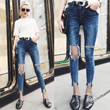 韩国大破洞乞丐网袜牛仔裤女九分紧身显瘦不规则毛边小脚铅笔裤潮