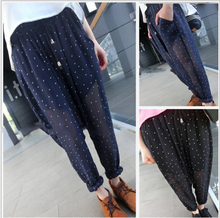 欧美风韩版街头帅气。抽绳波点透视雪纺裤长裤小脚裤休闲哈伦裤