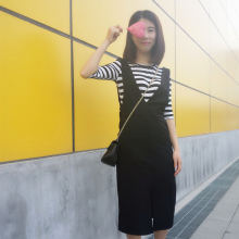 雪梨 夫人钱定制春季韩版高腰单排扣牛仔背带裙女学生百搭A字裙
