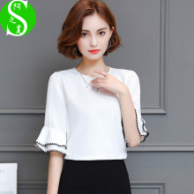 2017夏季新款韩版女装短款喇叭袖荷叶边雪纺衫百搭上衣白色小衫潮
