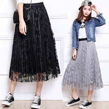 2017夏季新款高腰显瘦蕾丝中长款a字百褶网纱半身裙提花韩版长裙
