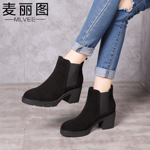 麦丽图新款秋冬高跟马丁靴女英伦风真皮女靴单靴圆头粗跟短靴子