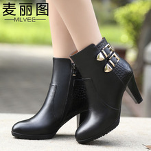 麦丽图秋冬新款真皮粗跟短靴女高跟马丁靴潮短筒棉靴女靴单靴裸靴