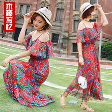 2017夏新款长裙韩版显瘦碎花露肩雪纺连衣裙波西米亚长裙度假沙滩
