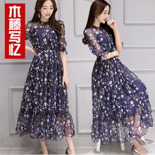 2017夏季新款韩版印花雪纺连衣裙女荷叶边修身显瘦复古碎花中长裙