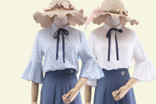 [小言家] 甜美清新细百褶喇叭袖蝴蝶结绑带宽松雪纺衬衫女上衣