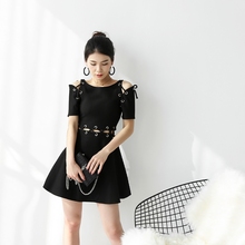 MT STUDIO定制 2017夏装新款系带个性高腰镂空短袖裙子女连衣裙