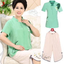 新款中老年人短袖宽松上衣中年女装妈妈装夏装棉麻套装40-50-60岁