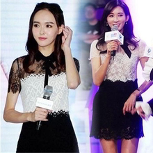 2017夏装新品唐嫣明星同款蕾丝时尚修身显瘦包臀衬衣领连衣裙女装