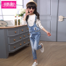 童装女童破洞牛仔背带裤中大童长裤2017春秋装儿童休闲牛仔裤韩版