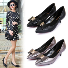 2017春新款女鞋韩版尖头猫跟鞋蝴蝶结中跟单鞋女金属色枪色小跟鞋