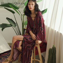度假女王复古雪纺喇叭袖蝙蝠款连衣裙大码高腰开叉长裙