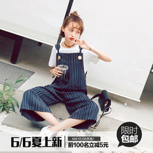 milktina大哥女夏2017新款韩版宽松学生百搭竖条纹背带九分阔腿裤