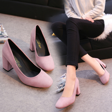 2016新款粗跟矮跟绒面女单鞋欧美浅口女鞋百搭气质圆头高跟单鞋