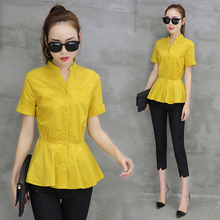 短袖小V领修身衬衫夏女小裙摆娃娃款开衫衬衣工作职业女装上衣潮