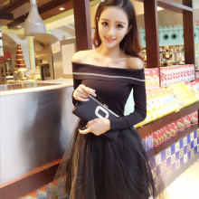2016秋装一字领性感露肩针织小黑裙女显瘦A字裙黑色连衣裙长袖潮