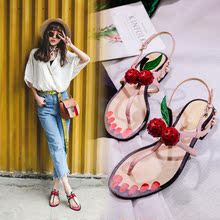 2017新款平底夹趾真皮凉鞋女夏季一字带罗马鞋粗跟学生樱桃鞋韩版