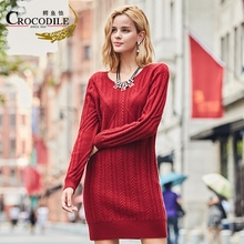 Crocodile/鳄鱼恤纯羊绒针织衫套头高领毛衣女士中长款连衣裙