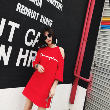 吸睛潮女装个性中长款拉链大开叉字母印染显瘦百搭连衣裙T恤裙