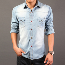 古仕卡特水洗牛仔布长袖衬衣时尚都市春季男装尖领衬衫 衫衬