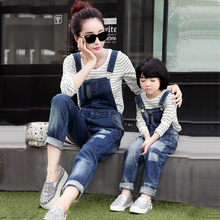 欧洲站春秋装女装长袖T+破洞背带裤亲子牛仔裤套装女式运动套装潮