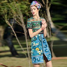 欧洲站2017夏季新款女进口麻料定位印花时尚清新修身短袖连衣裙子