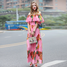 一字领双层短袖大摆长裙高端丝质绸缎料印花印菠萝礼服裙连衣裙潮